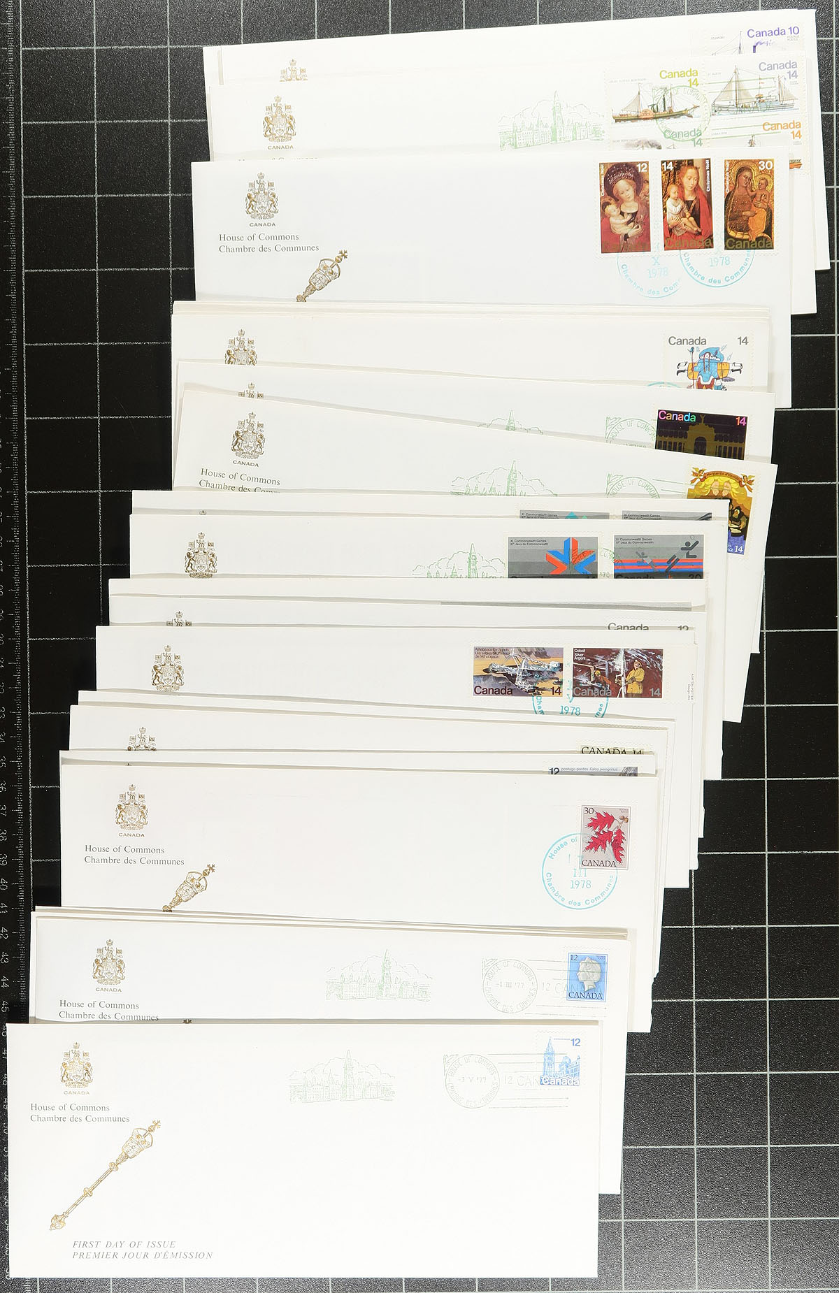 First Day Covers. Collection of roughly 150 "Senate of Canada" first day covers, 1960's-1970's, with singles, sets, and plate block franking, noting various inks and postmarks, along with a few having privately made cachets. The lot also includes 20 pilot signed "Snow Bird" covers, all with Senate of Canada postmarks. A nice lot for the first day cover specialist. Estimate =