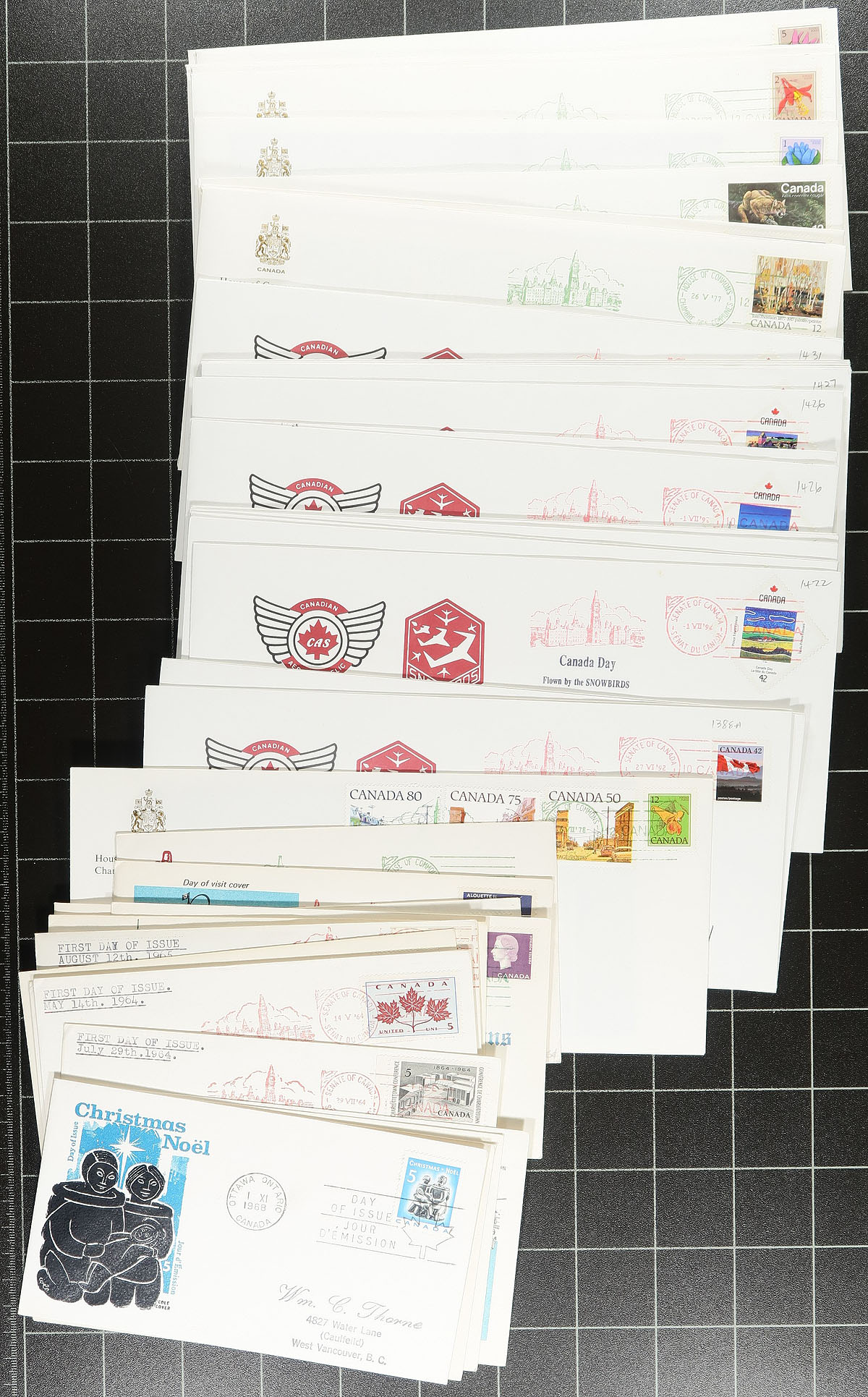 First Day Covers. Collection of roughly 150 "Senate of Canada" first day covers, 1960's-1970's, with singles, sets, and plate block franking, noting various inks and postmarks, along with a few having privately made cachets. The lot also includes 20 pilot signed "Snow Bird" covers, all with Senate of Canada postmarks. A nice lot for the first day cover specialist. Estimate =