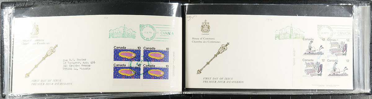 First Day Covers. Collection of roughly 150 "Senate of Canada" first day covers, 1960's-1970's, with singles, sets, and plate block franking, noting various inks and postmarks, along with a few having privately made cachets. The lot also includes 20 pilot signed "Snow Bird" covers, all with Senate of Canada postmarks. A nice lot for the first day cover specialist. Estimate =