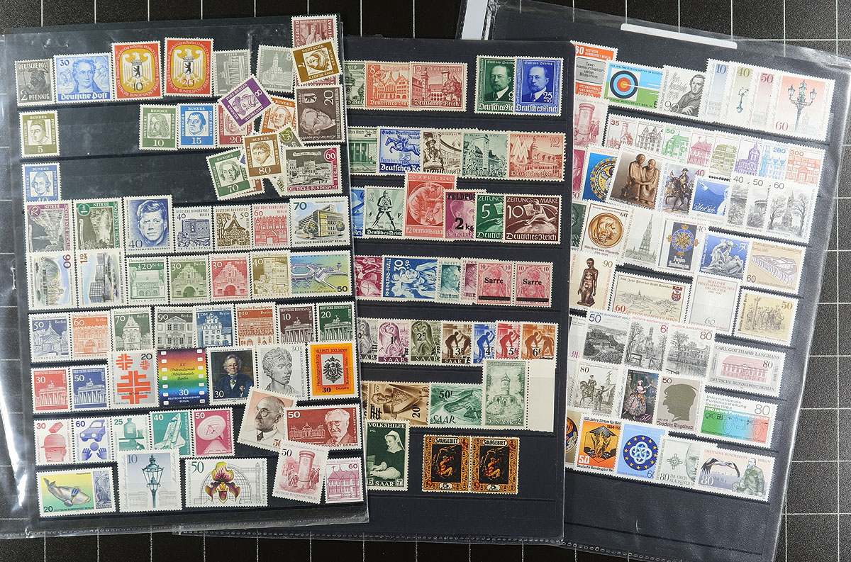 Accumulation of primarily never hinged Germany, 1918-2001, containing over 800 stamps in roughly 15 stock pages and loose material. The lot contains a decent variety of material with representation from Germany, DDR, Berlin, and Saar, noting singles, sets, partial sets, a fee coils, booklets, se-tenants, and more, noting a few items cataloguing $5 to $10 each. Online pictures show an overview of this well organized group. Owner's older 2019 Scott US$1,424.00 =