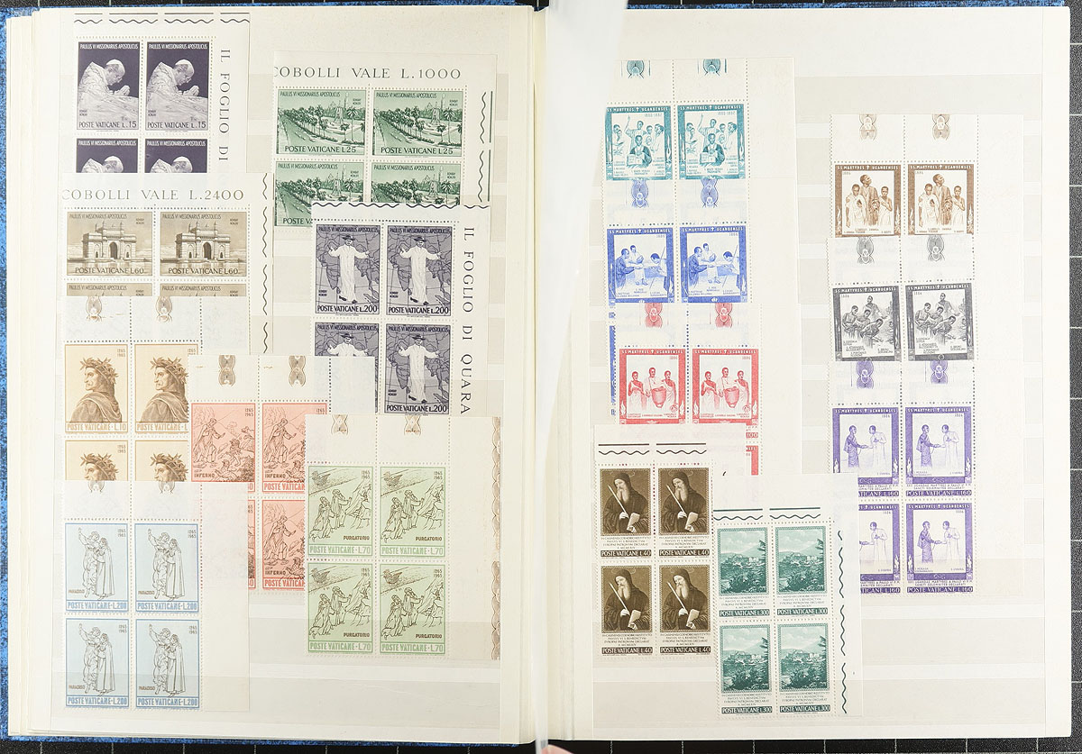 Lovely collection of never hinged Vatican City corner blocks, 1963-1976, containing over 200 blocks housed in a stockbook, ranging from Scott #362/606. A nice clean lot for all, especially topical and thematic collectors. Estimate =