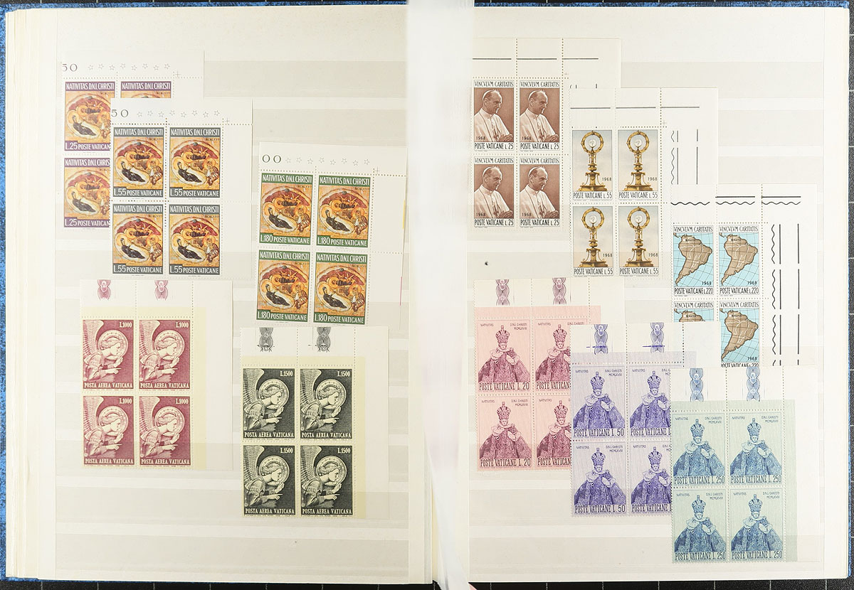 Lovely collection of never hinged Vatican City corner blocks, 1963-1976, containing over 200 blocks housed in a stockbook, ranging from Scott #362/606. A nice clean lot for all, especially topical and thematic collectors. Estimate =