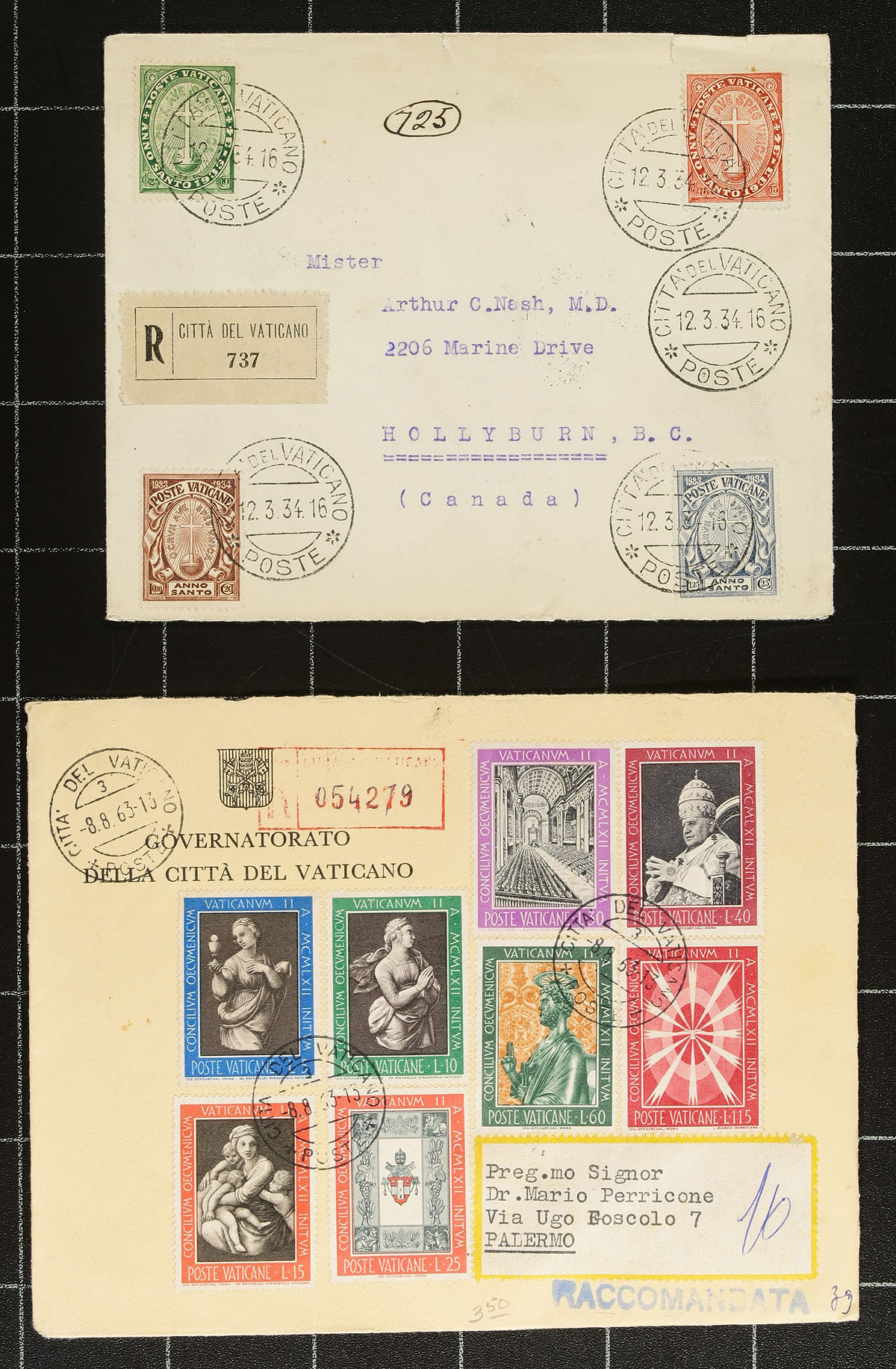Collection of roughly 450 Vatican City covers and cards, 1940's-2010's, with the majority of material being maximum cards from the 1960's-1970's, along with roughly 75 first day covers, postcards, flyers, and more. A few covers are priced in the $5 to $10 range. A nice lot for the cover, topical, or thematic collector. Overall fine to very fine. Estimate =