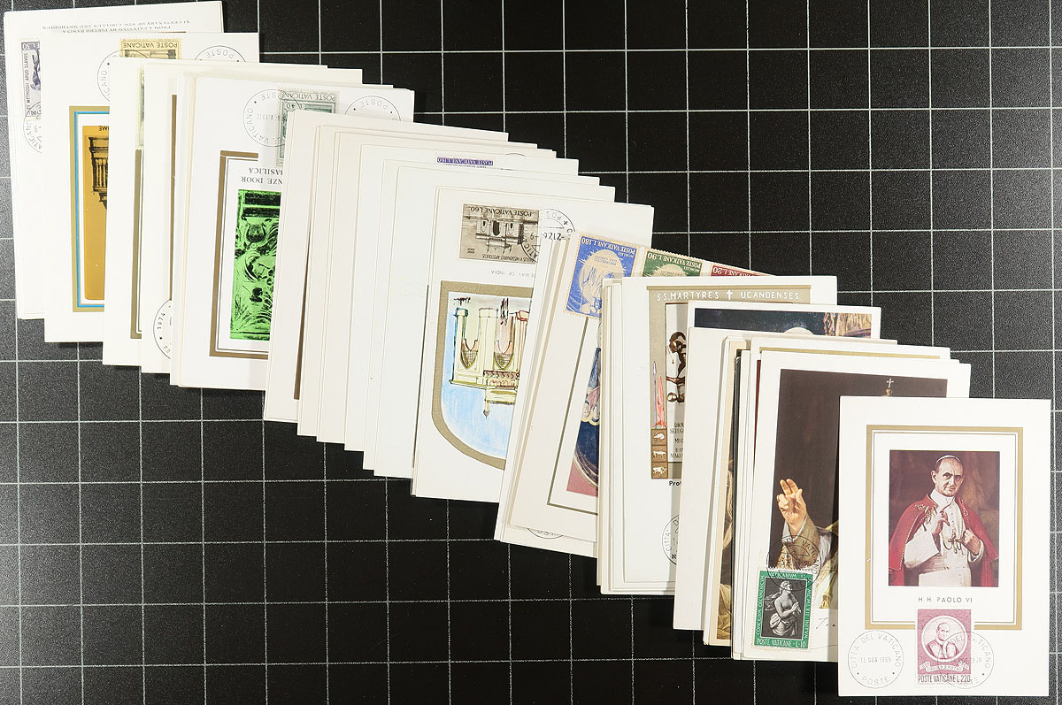 Collection of roughly 450 Vatican City covers and cards, 1940's-2010's, with the majority of material being maximum cards from the 1960's-1970's, along with roughly 75 first day covers, postcards, flyers, and more. A few covers are priced in the $5 to $10 range. A nice lot for the cover, topical, or thematic collector. Overall fine to very fine. Estimate =