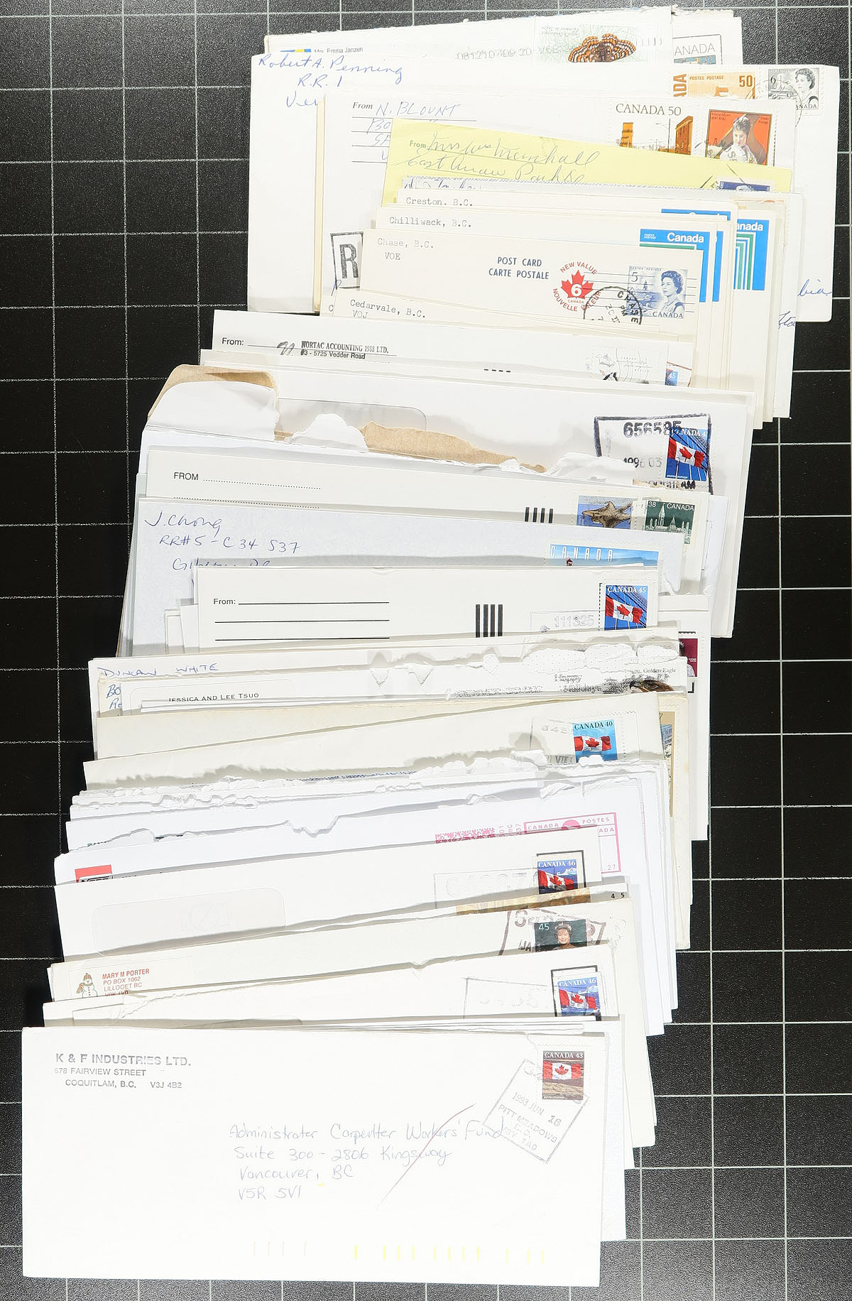 British Columbia Postal History. Accumulation of roughly 500 covers, collected for BC postmarks, 1920's-2010's, with roughly a few hundred towns represented, noting a variety of town postmarks including cds, split ring, MOON, POCON, Klussendorf, and other types. Just a few of the towns include Dease Lake, Spences Bridge, Chetwynd, Mill Bay, Falkland, Brackendale, Bowen Island, Dewdney, and much more. The covers all appear to be commercial in nature, noting several Christmas stamp frankings, a few registered letters, corner advertising, etc. A few faults to be expected as is the nature of commercial mail. A nice lot for the BC postmark hunter. Estimate =