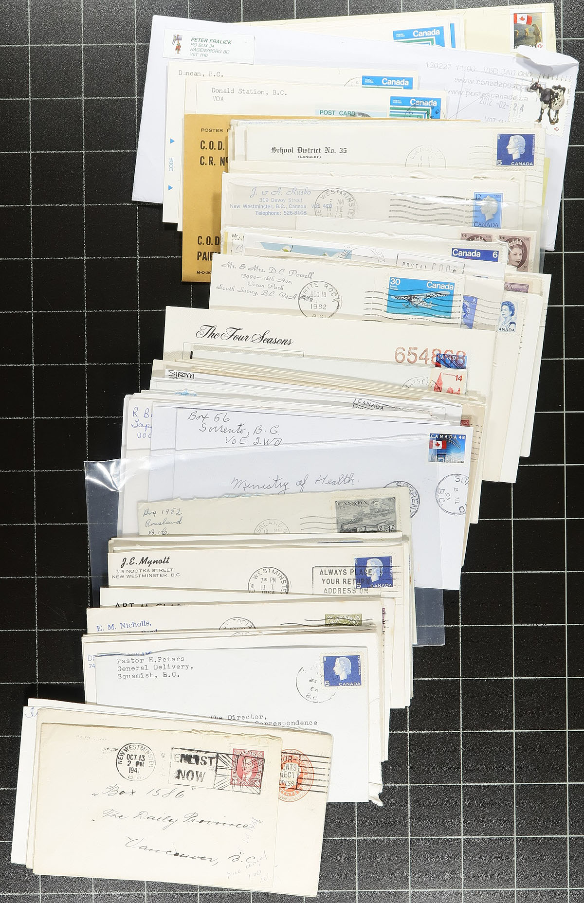 British Columbia Postal History. Accumulation of roughly 500 covers, collected for BC postmarks, 1920's-2010's, with roughly a few hundred towns represented, noting a variety of town postmarks including cds, split ring, MOON, POCON, Klussendorf, and other types. Just a few of the towns include Dease Lake, Spences Bridge, Chetwynd, Mill Bay, Falkland, Brackendale, Bowen Island, Dewdney, and much more. The covers all appear to be commercial in nature, noting several Christmas stamp frankings, a few registered letters, corner advertising, etc. A few faults to be expected as is the nature of commercial mail. A nice lot for the BC postmark hunter. Estimate =