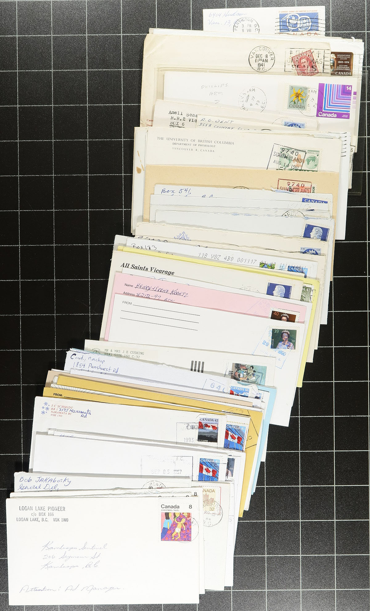 British Columbia Postal History. Accumulation of roughly 500 covers, collected for BC postmarks, 1920's-2010's, with roughly a few hundred towns represented, noting a variety of town postmarks including cds, split ring, MOON, POCON, Klussendorf, and other types. Just a few of the towns include Dease Lake, Spences Bridge, Chetwynd, Mill Bay, Falkland, Brackendale, Bowen Island, Dewdney, and much more. The covers all appear to be commercial in nature, noting several Christmas stamp frankings, a few registered letters, corner advertising, etc. A few faults to be expected as is the nature of commercial mail. A nice lot for the BC postmark hunter. Estimate =
