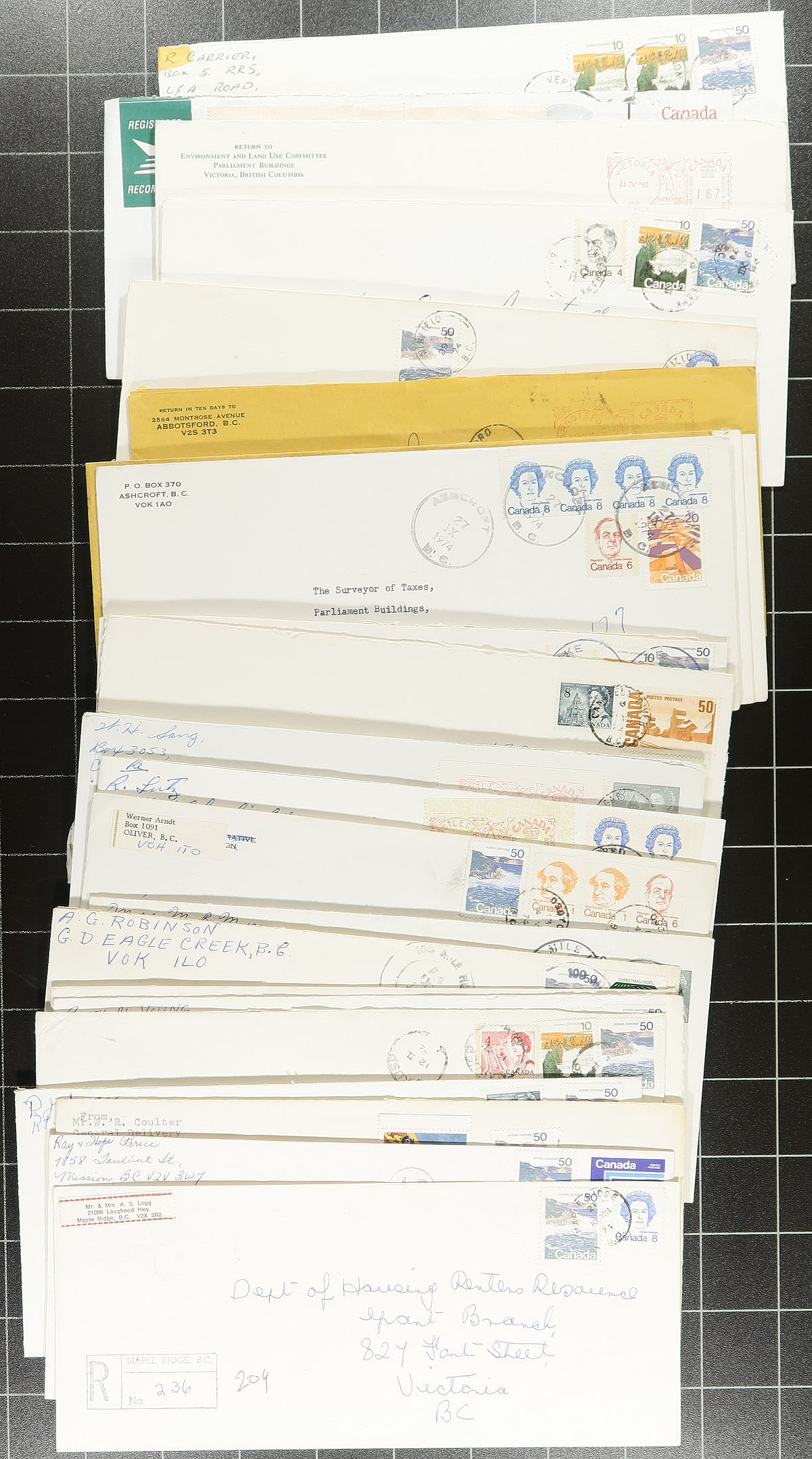 British Columbia Postal History. Group of roughly 145 Canada registered covers, 1960's-1980's, with over 100 having BC postmarks, noting a variety of rates and frankings (including several meters). Postmark interest includes CDS and POCON types. A nice lot for the postal history collector or postmark hunter. A few faults to be expected as is the nature of commercial mail. Estimate =