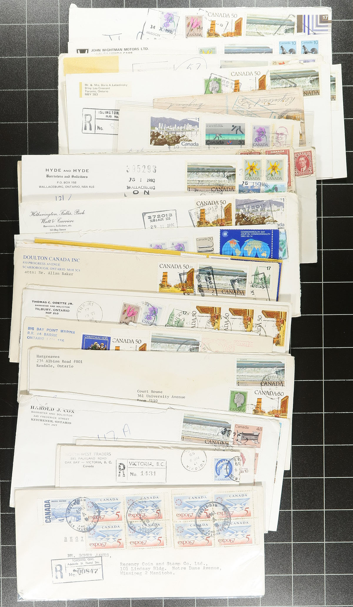 British Columbia Postal History. Group of roughly 145 Canada registered covers, 1960's-1980's, with over 100 having BC postmarks, noting a variety of rates and frankings (including several meters). Postmark interest includes CDS and POCON types. A nice lot for the postal history collector or postmark hunter. A few faults to be expected as is the nature of commercial mail. Estimate =