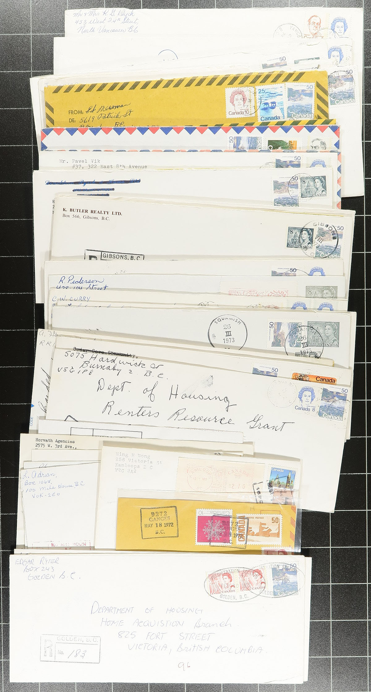 British Columbia Postal History. Group of roughly 145 Canada registered covers, 1960's-1980's, with over 100 having BC postmarks, noting a variety of rates and frankings (including several meters). Postmark interest includes CDS and POCON types. A nice lot for the postal history collector or postmark hunter. A few faults to be expected as is the nature of commercial mail. Estimate =