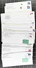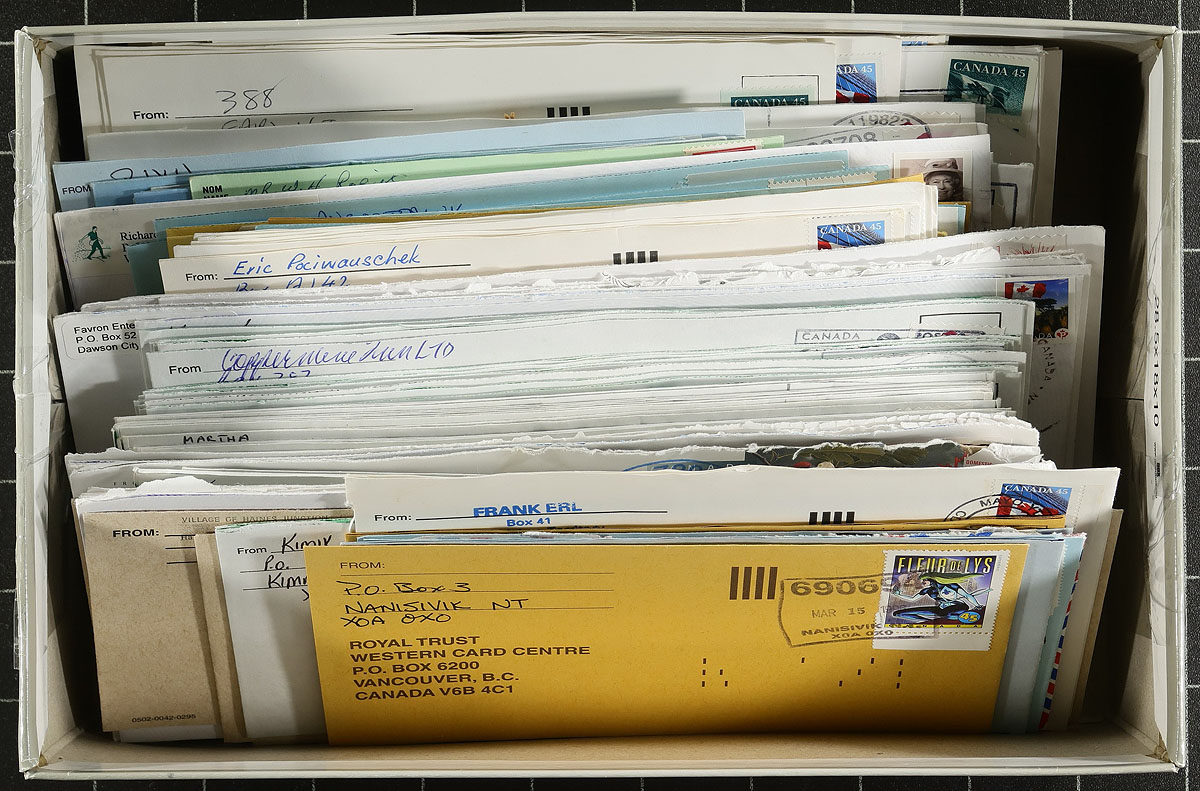 Group of roughly 140 covers collected for Territory cancels, 1970's-1990's, with some material possible on both sides of the given range. We note roughly 50 different towns from the Yukon and Northwest Territories, along with Nunavut. Just a few of the towns encountered include Kimmirut, Igloolik, Whale Cove, Sanikluaq, Sanikilua, Coral Harbour, Nanisivik, with postmark interest including CDS, POCON, and Pictorial types, with some towns have a variety of postmark types. A nice lot for the postmark hunter. Estimate =