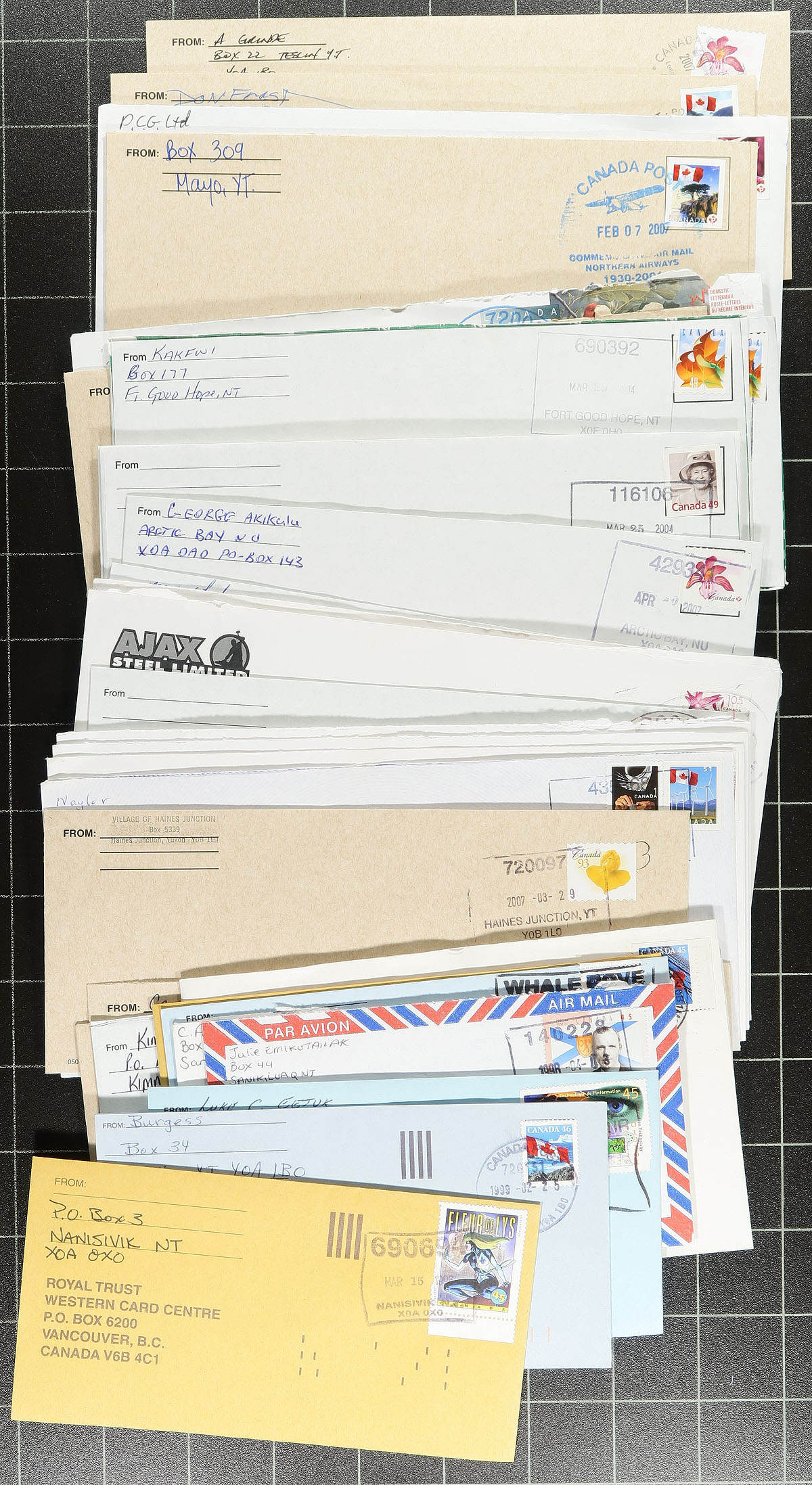 Group of roughly 140 covers collected for Territory cancels, 1970's-1990's, with some material possible on both sides of the given range. We note roughly 50 different towns from the Yukon and Northwest Territories, along with Nunavut. Just a few of the towns encountered include Kimmirut, Igloolik, Whale Cove, Sanikluaq, Sanikilua, Coral Harbour, Nanisivik, with postmark interest including CDS, POCON, and Pictorial types, with some towns have a variety of postmark types. A nice lot for the postmark hunter. Estimate =