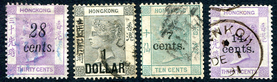 A used quartet of QV overprint issues, including the 1876 issued 28c on 30c violet, 1891 issued $1.00 on 96c gray and 1891 issued 7c on 10c green / 14c on 30c violet. Nice sound stamps, with only a couple of very minor perf faults. 2025 Scott US$204.50 =
