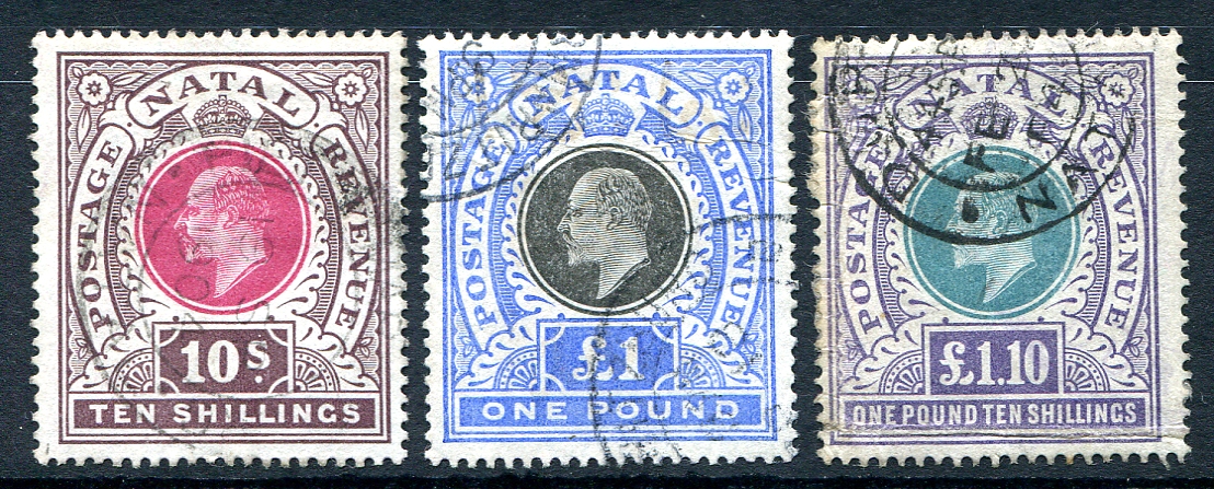 VF used trip of 1902-1903 Edward VII (watermark 1) large format high-values including the 10sh brown and deep rose, £1.00 ultra and black and £1.10 violet and blue green. Striking high-quality used stamps. 2025 Scott US$270.00 =