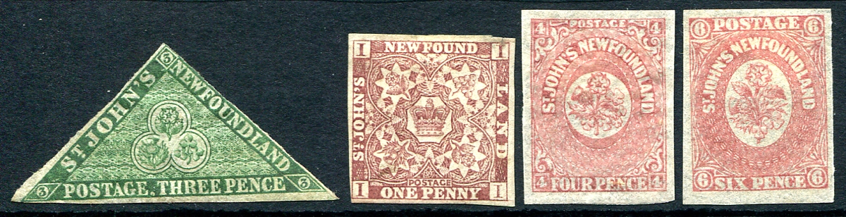 A mint quartet of 1860-1862 Newfoundland Pence issues including the 1860 issued 3p green, 1861 issued 1p violet brown, 4p rose and 6p rose. All hinged with part original gum, as often found on these issues. 2025 Scott US$295.00 =