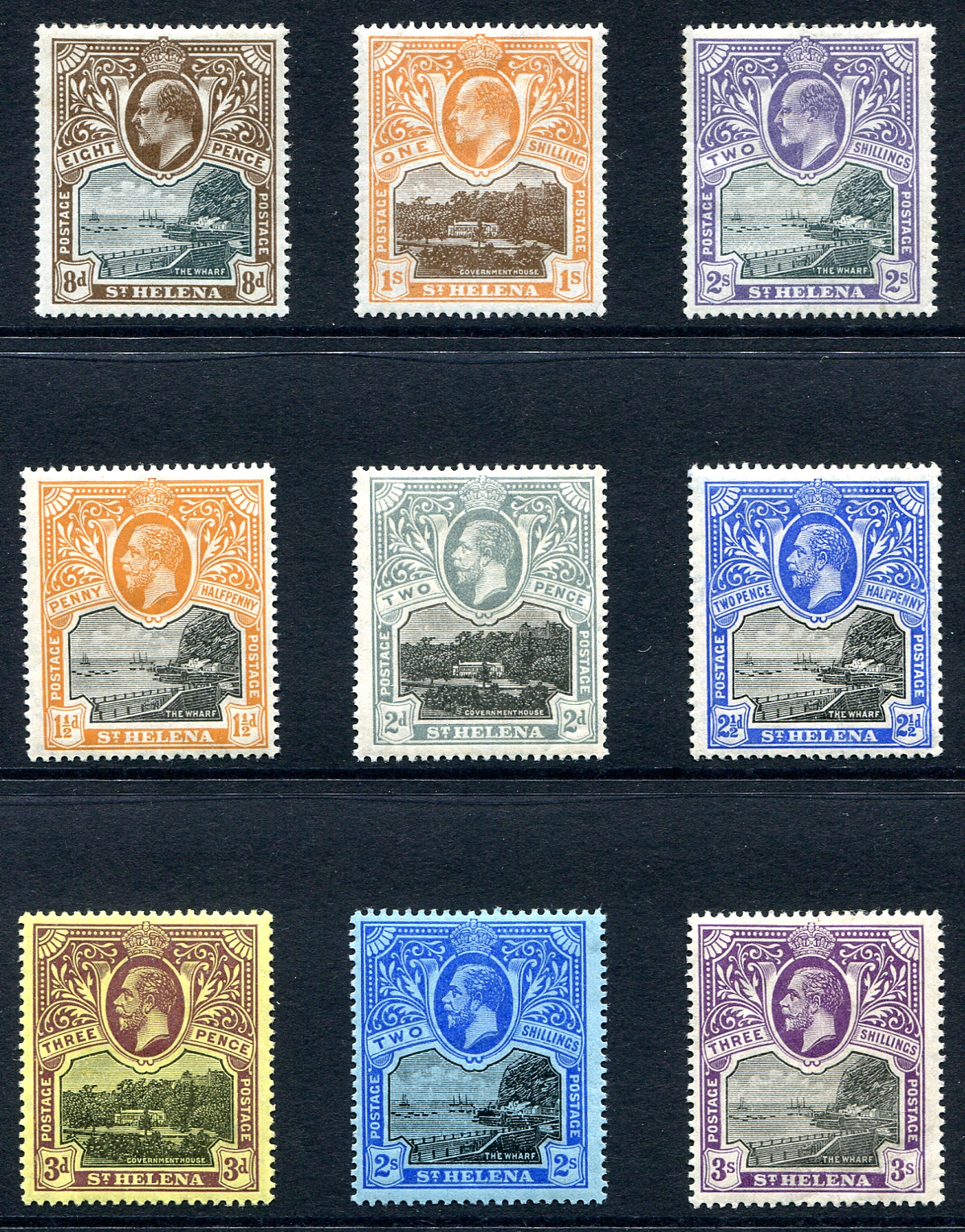 F/VF mint Hinged selection of 9 different Edward VII / George V issues. Includes Edward VII 1903 issued 8p brown black, 1sh orange buff and brown and 2sh violet and black, followed by six different George V values to the 3sh violet and black high-value. Nice colour throughout. 2025 Scott US$264.25 =