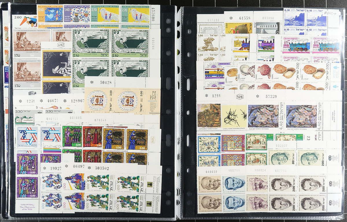 Collection of never hinged Israel, 1955-1978, containing a few thousand stamps, including singles and primarily plate blocks in several stock pages. The collection begins with roughly 100 singles with tabs ranging from 1955 to 1973, and roughly 550 plate blocks (noting UR and LR tab corner blocks), ranging from 1960 to 1978. A clean lot for all collectors, very fine. Owner's older Scott US$734.00 =