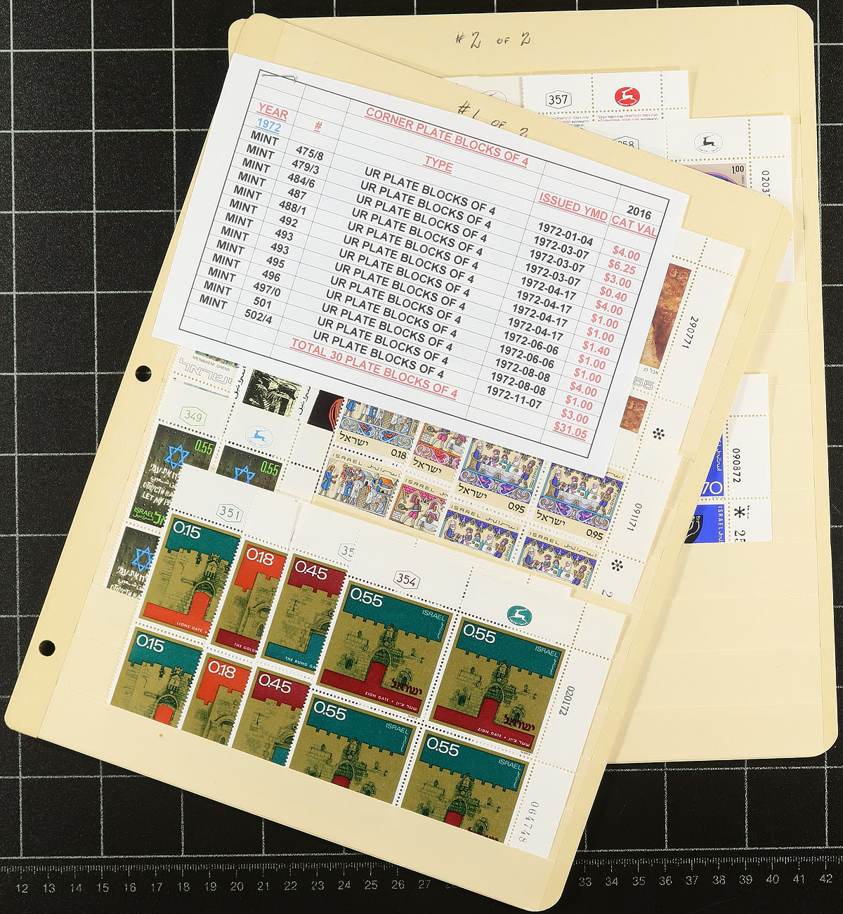Collection of never hinged Israel, 1955-1978, containing a few thousand stamps, including singles and primarily plate blocks in several stock pages. The collection begins with roughly 100 singles with tabs ranging from 1955 to 1973, and roughly 550 plate blocks (noting UR and LR tab corner blocks), ranging from 1960 to 1978. A clean lot for all collectors, very fine. Owner's older Scott US$734.00 =