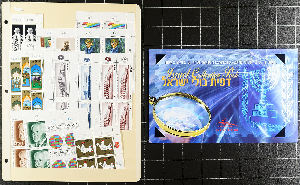 Collection of never hinged Israel, 1955-1978, containing a few thousand stamps, including singles and primarily plate blocks in several stock pages. The collection begins with roughly 100 singles with tabs ranging from 1955 to 1973, and roughly 550 plate blocks (noting UR and LR tab corner blocks), ranging from 1960 to 1978. A clean lot for all collectors, very fine. Owner's older Scott US$734.00 =