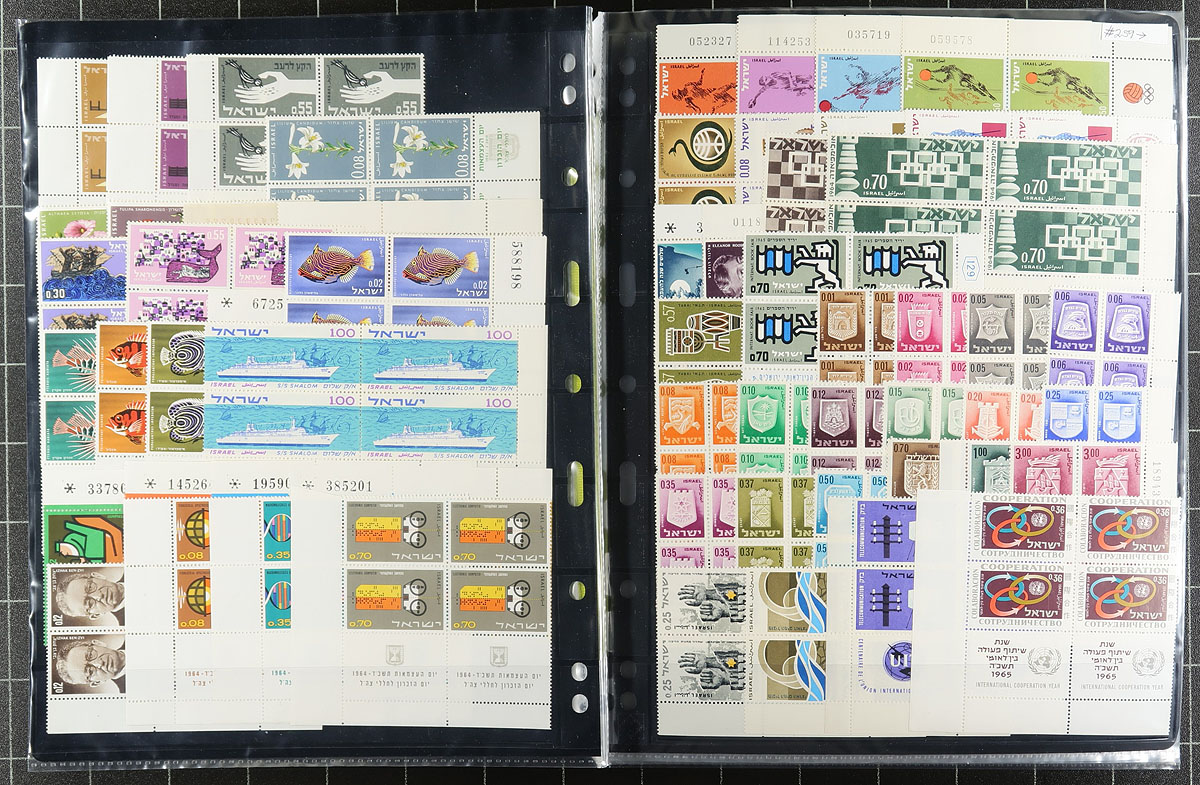 Collection of never hinged Israel, 1955-1978, containing a few thousand stamps, including singles and primarily plate blocks in several stock pages. The collection begins with roughly 100 singles with tabs ranging from 1955 to 1973, and roughly 550 plate blocks (noting UR and LR tab corner blocks), ranging from 1960 to 1978. A clean lot for all collectors, very fine. Owner's older Scott US$734.00 =