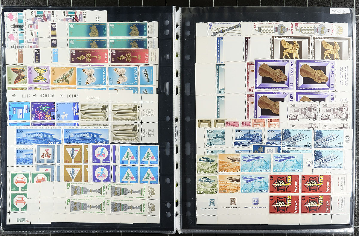 Collection of never hinged Israel, 1955-1978, containing a few thousand stamps, including singles and primarily plate blocks in several stock pages. The collection begins with roughly 100 singles with tabs ranging from 1955 to 1973, and roughly 550 plate blocks (noting UR and LR tab corner blocks), ranging from 1960 to 1978. A clean lot for all collectors, very fine. Owner's older Scott US$734.00 =