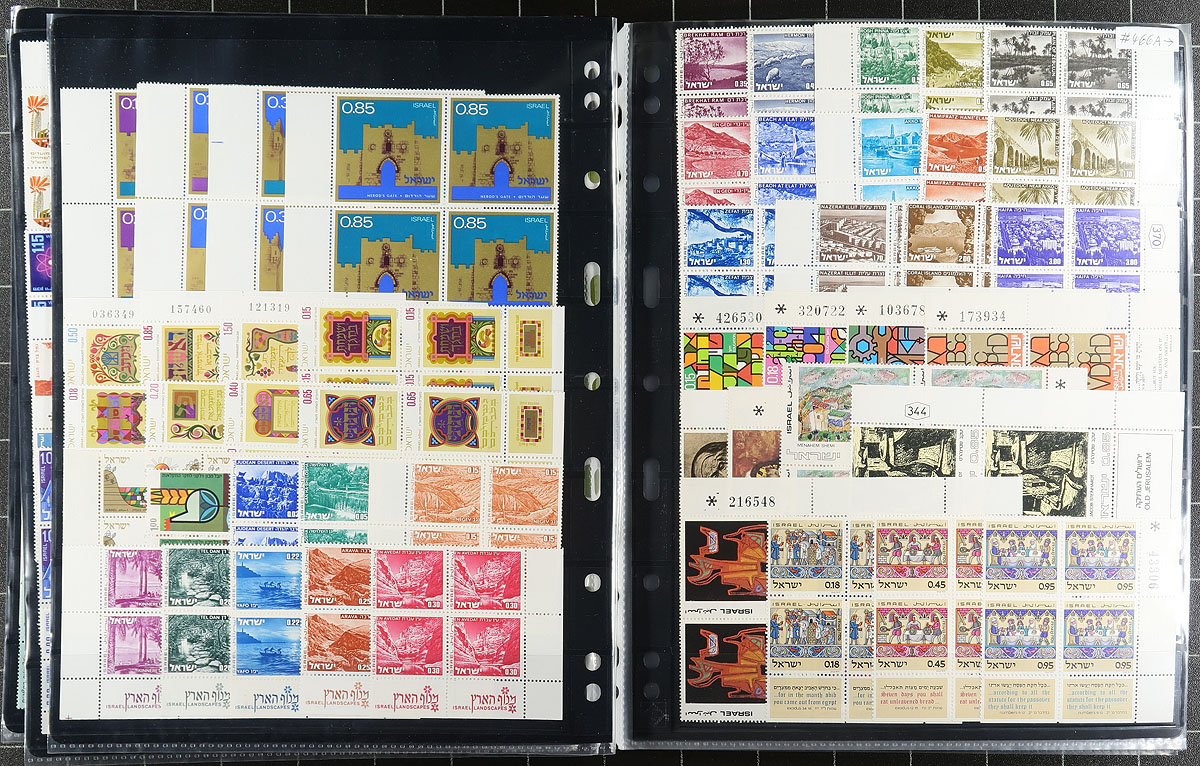 Collection of never hinged Israel, 1955-1978, containing a few thousand stamps, including singles and primarily plate blocks in several stock pages. The collection begins with roughly 100 singles with tabs ranging from 1955 to 1973, and roughly 550 plate blocks (noting UR and LR tab corner blocks), ranging from 1960 to 1978. A clean lot for all collectors, very fine. Owner's older Scott US$734.00 =