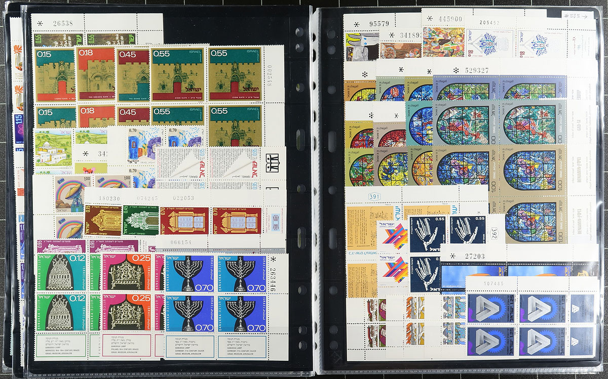Collection of never hinged Israel, 1955-1978, containing a few thousand stamps, including singles and primarily plate blocks in several stock pages. The collection begins with roughly 100 singles with tabs ranging from 1955 to 1973, and roughly 550 plate blocks (noting UR and LR tab corner blocks), ranging from 1960 to 1978. A clean lot for all collectors, very fine. Owner's older Scott US$734.00 =