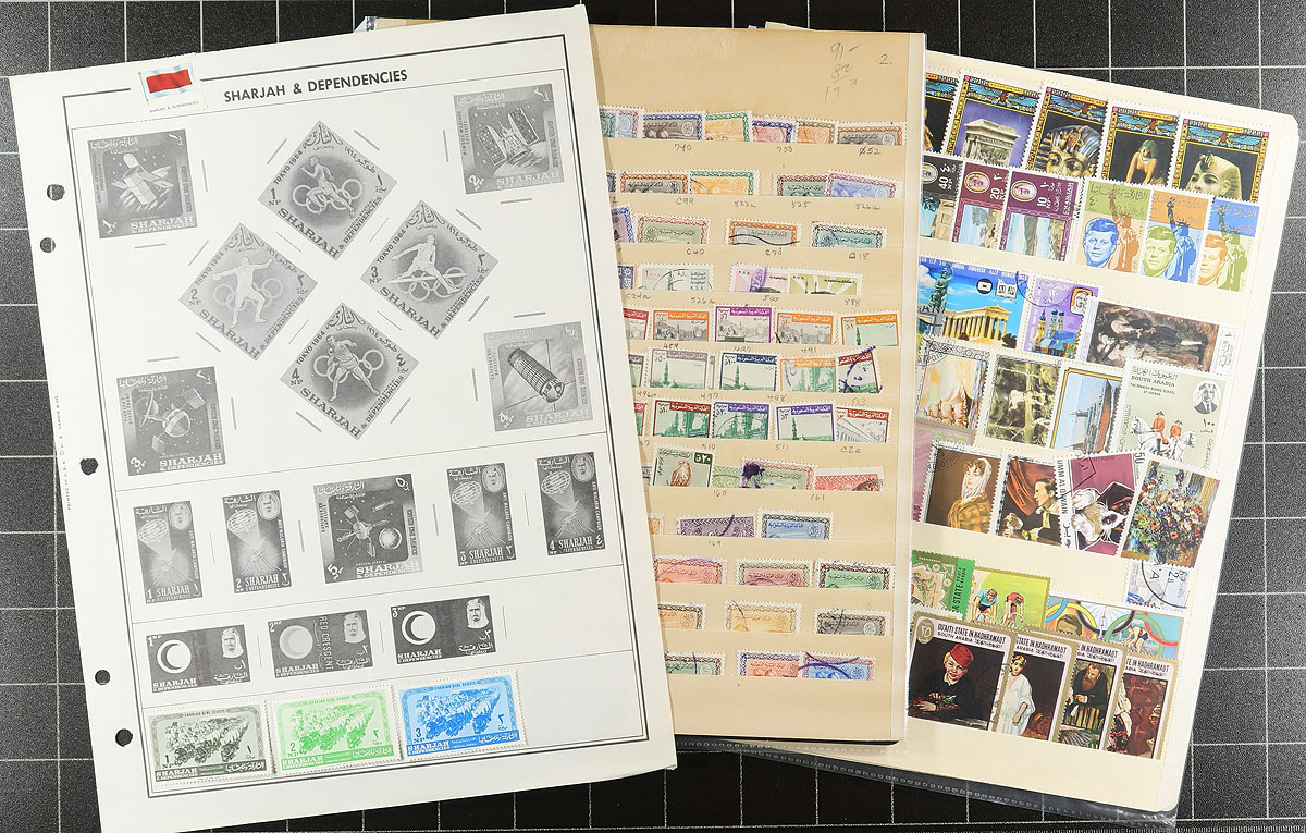 Accumulation of mint and used Middle East stamps, 1930's-1970's, containing roughly 1,000 stamps in a variety of formats. We note representation from Saudi Arabia, Iran, Iraq, Bahrain, Kuwait, just to name a few, noting singles, sets, partial sets, imperforate stamps, a few souvenir sheets, overprinted stamps, and more. Owner's older Scott catalogue value for the lot totals US$905.00, leaving finds to the dedicated collector. Online photos show an overview, noting a few faults on a few stamps, overall fine to very fine. Estimate =