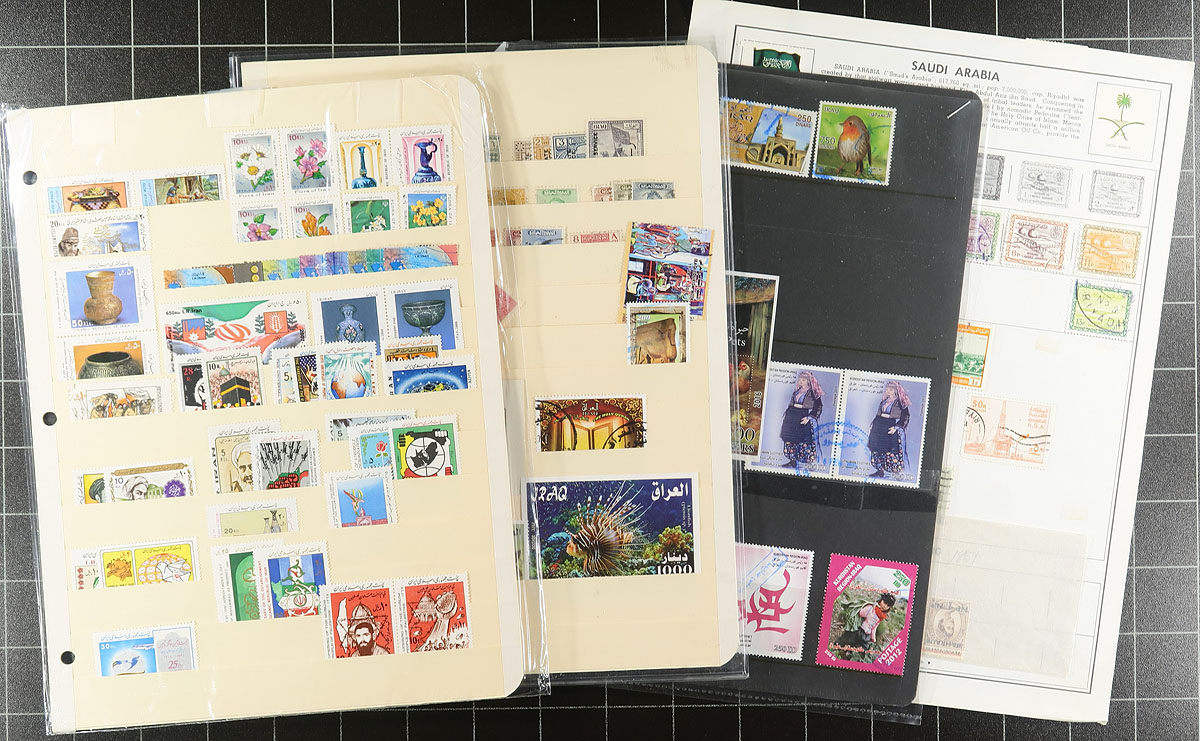 Accumulation of mint and used Middle East stamps, 1930's-1970's, containing roughly 1,000 stamps in a variety of formats. We note representation from Saudi Arabia, Iran, Iraq, Bahrain, Kuwait, just to name a few, noting singles, sets, partial sets, imperforate stamps, a few souvenir sheets, overprinted stamps, and more. Owner's older Scott catalogue value for the lot totals US$905.00, leaving finds to the dedicated collector. Online photos show an overview, noting a few faults on a few stamps, overall fine to very fine. Estimate =