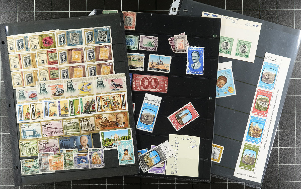 Accumulation of mint and used Middle East stamps, 1930's-1970's, containing roughly 1,000 stamps in a variety of formats. We note representation from Saudi Arabia, Iran, Iraq, Bahrain, Kuwait, just to name a few, noting singles, sets, partial sets, imperforate stamps, a few souvenir sheets, overprinted stamps, and more. Owner's older Scott catalogue value for the lot totals US$905.00, leaving finds to the dedicated collector. Online photos show an overview, noting a few faults on a few stamps, overall fine to very fine. Estimate =