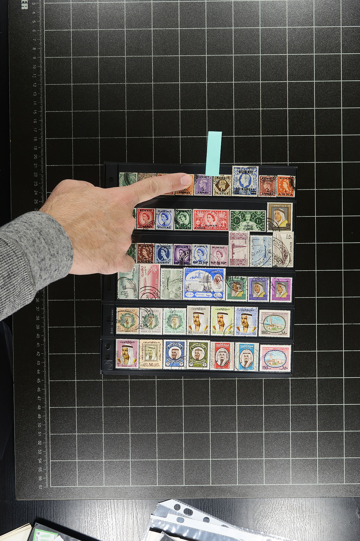 Accumulation of mint and used Middle East stamps, 1930's-1970's, containing roughly 1,000 stamps in a variety of formats. We note representation from Saudi Arabia, Iran, Iraq, Bahrain, Kuwait, just to name a few, noting singles, sets, partial sets, imperforate stamps, a few souvenir sheets, overprinted stamps, and more. Owner's older Scott catalogue value for the lot totals US$905.00, leaving finds to the dedicated collector. Online photos show an overview, noting a few faults on a few stamps, overall fine to very fine. Estimate =
