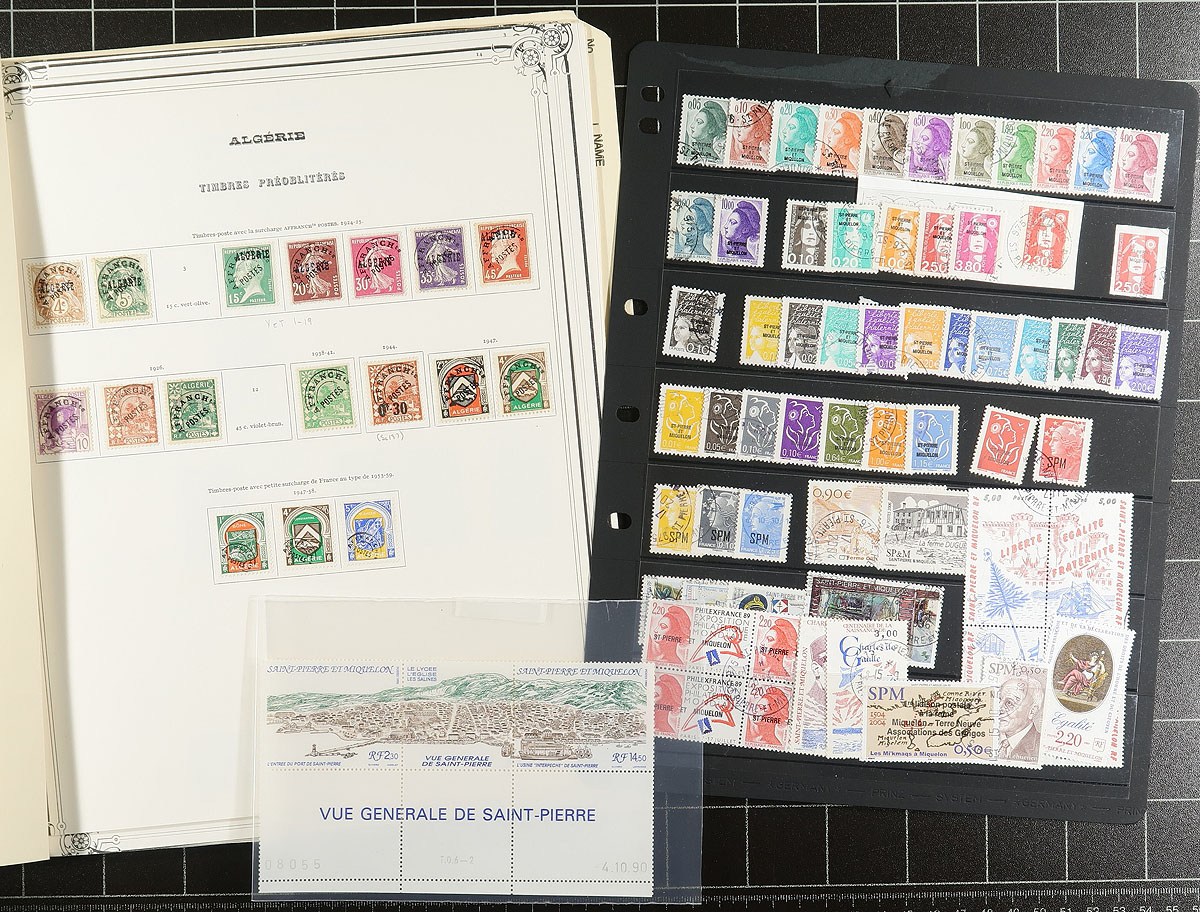Accumulation of mint and used French Colonies, 1950's-1980's, containing roughly 900 stamps in a variety of formats. We note representation from St. Pierre et Miquelon, Chad, Central Africa, and other French Africa colonies., noting singles, sets, partial sets, imperforate stamps, souvenir sheets and sheetlets, and more. A spot check indicated a few items cataloguing $10 and up with owner's older catalogue value for the lot totals US$913.00. Online photos show an overview, overall fine to very fine. Estimate =