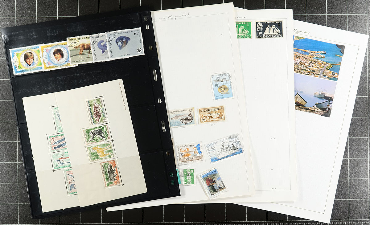 Accumulation of mint and used French Colonies, 1950's-1980's, containing roughly 900 stamps in a variety of formats. We note representation from St. Pierre et Miquelon, Chad, Central Africa, and other French Africa colonies., noting singles, sets, partial sets, imperforate stamps, souvenir sheets and sheetlets, and more. A spot check indicated a few items cataloguing $10 and up with owner's older catalogue value for the lot totals US$913.00. Online photos show an overview, overall fine to very fine. Estimate =