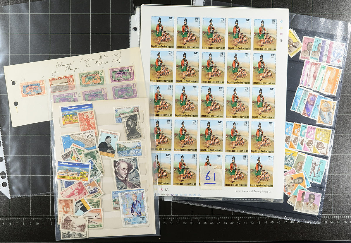Accumulation of mint and used French Colonies, 1950's-1980's, containing roughly 900 stamps in a variety of formats. We note representation from St. Pierre et Miquelon, Chad, Central Africa, and other French Africa colonies., noting singles, sets, partial sets, imperforate stamps, souvenir sheets and sheetlets, and more. A spot check indicated a few items cataloguing $10 and up with owner's older catalogue value for the lot totals US$913.00. Online photos show an overview, overall fine to very fine. Estimate =