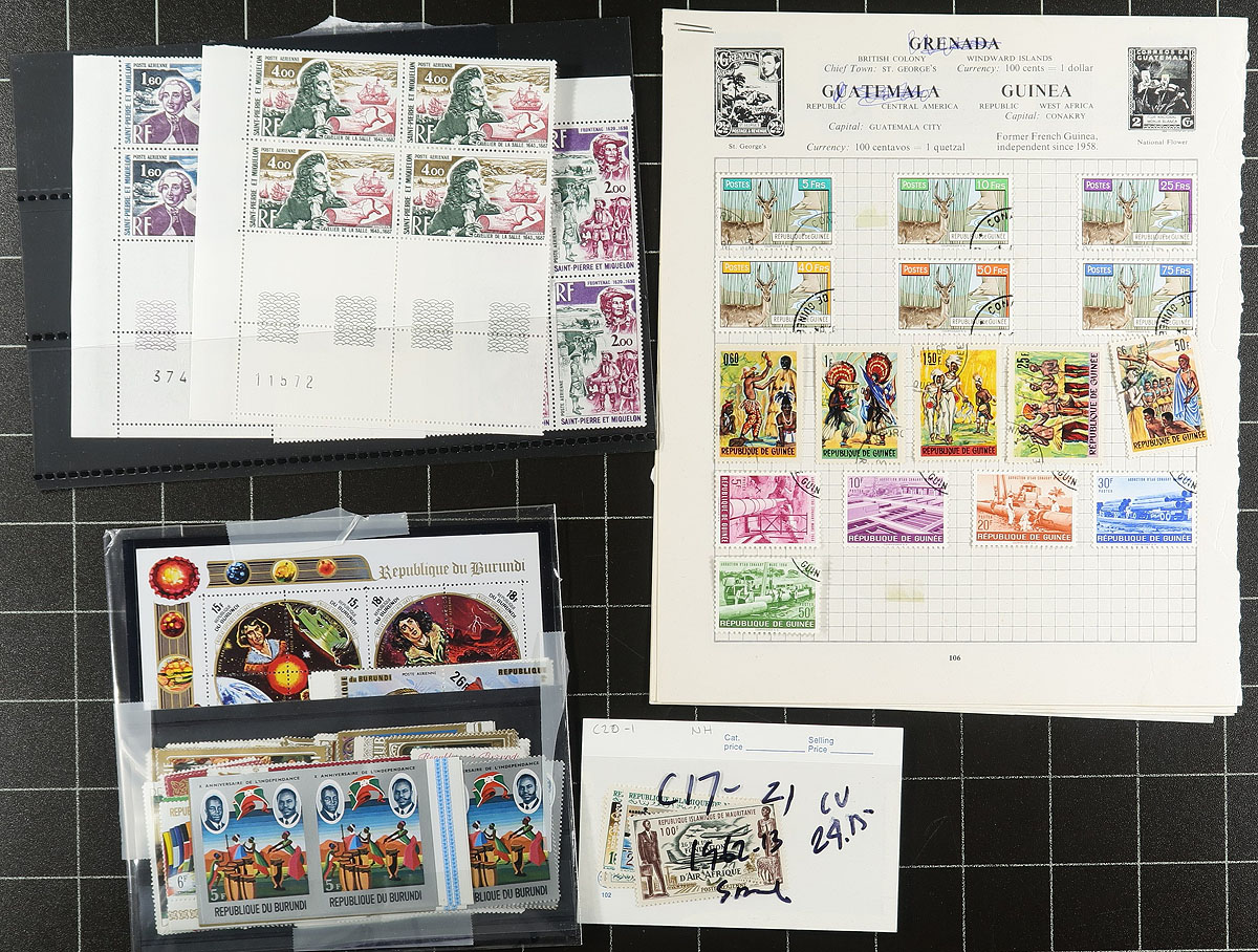 Accumulation of mint and used French Colonies, 1950's-1980's, containing roughly 900 stamps in a variety of formats. We note representation from St. Pierre et Miquelon, Chad, Central Africa, and other French Africa colonies., noting singles, sets, partial sets, imperforate stamps, souvenir sheets and sheetlets, and more. A spot check indicated a few items cataloguing $10 and up with owner's older catalogue value for the lot totals US$913.00. Online photos show an overview, overall fine to very fine. Estimate =