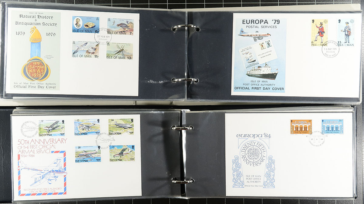 Accumulation of Channel Islands first day covers, 1970's-1990's, containing several hundreds of covers, in 4 cover albums and loose material filling a bankers box. The majority of covers are from Isle of Man, along some representation from Guernsey and Jersey, noting the vast majority having sets frankings. A good lot for collectors, and dealers, noting a good array of topical and thematic subjects, overall fine to very fine. Estimate =