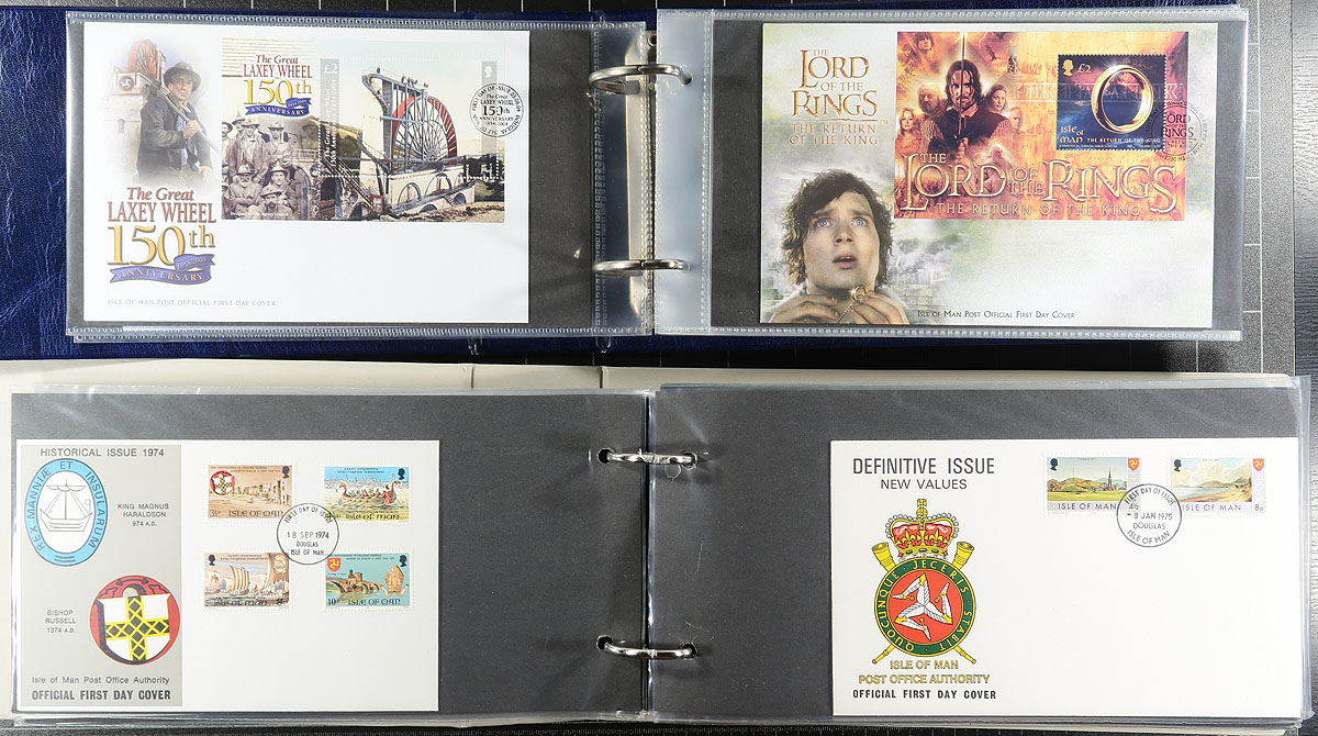 Accumulation of Channel Islands first day covers, 1970's-1990's, containing several hundreds of covers, in 4 cover albums and loose material filling a bankers box. The majority of covers are from Isle of Man, along some representation from Guernsey and Jersey, noting the vast majority having sets frankings. A good lot for collectors, and dealers, noting a good array of topical and thematic subjects, overall fine to very fine. Estimate =