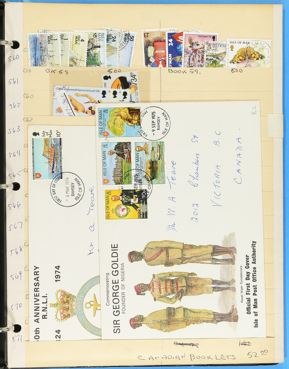 Collection of primarily never hinged Isle of Man, 1973-1992, containing many hundreds of stamps, noting several sets, souvenir sheets, gutter pairs, along with 35 covers (mostly first day covers), and a few revenue issues, in several stock pages housed in a binder. A spot check indicated some material cataloguing $5 to $10 each, face value alone totals £172. A good lot for Commonwealth collectors, and should be expanded further, overall fine to very fine. Estimate =