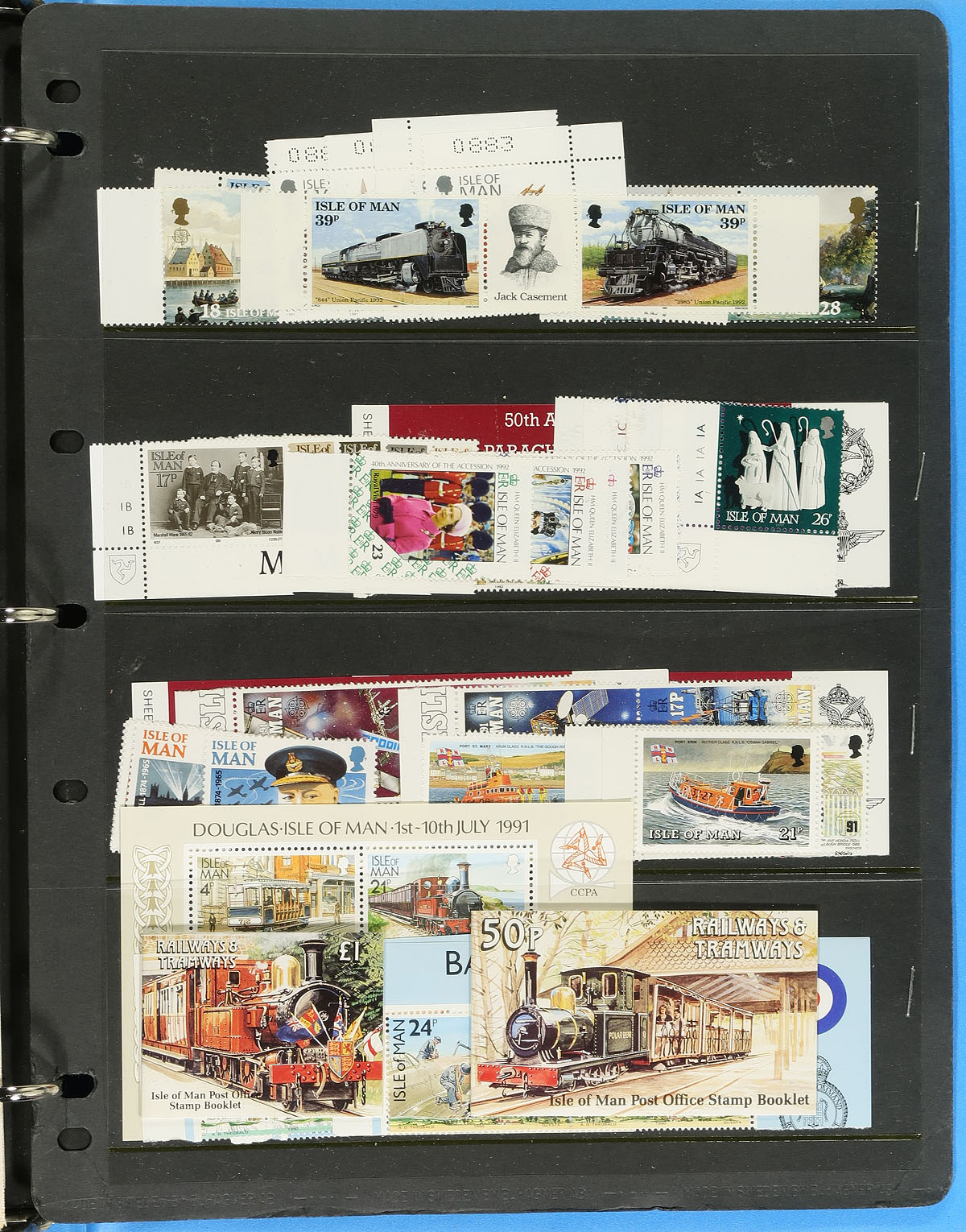 Collection of primarily never hinged Isle of Man, 1973-1992, containing many hundreds of stamps, noting several sets, souvenir sheets, gutter pairs, along with 35 covers (mostly first day covers), and a few revenue issues, in several stock pages housed in a binder. A spot check indicated some material cataloguing $5 to $10 each, face value alone totals £172. A good lot for Commonwealth collectors, and should be expanded further, overall fine to very fine. Estimate =
