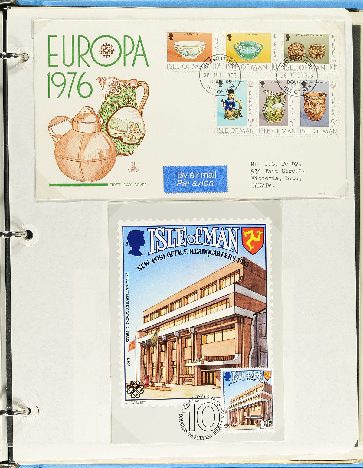Collection of primarily never hinged Isle of Man, 1973-1992, containing many hundreds of stamps, noting several sets, souvenir sheets, gutter pairs, along with 35 covers (mostly first day covers), and a few revenue issues, in several stock pages housed in a binder. A spot check indicated some material cataloguing $5 to $10 each, face value alone totals £172. A good lot for Commonwealth collectors, and should be expanded further, overall fine to very fine. Estimate =