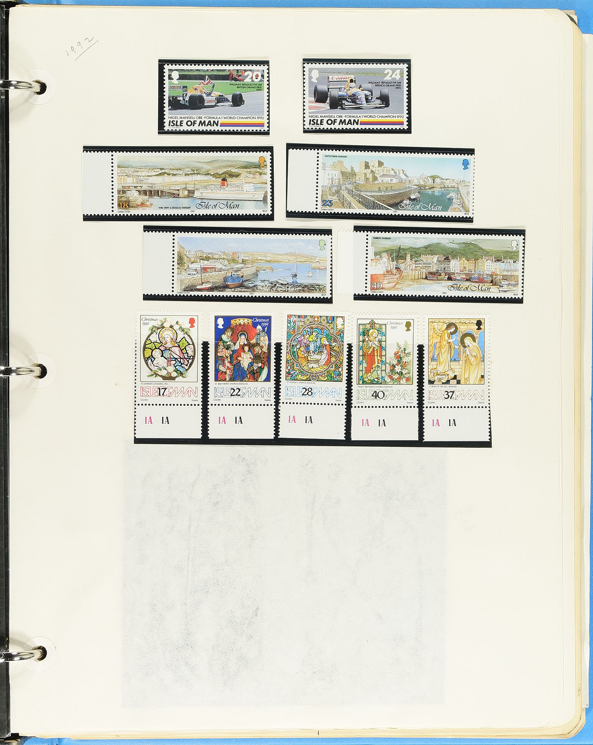 Collection of primarily never hinged Isle of Man, 1973-1992, containing many hundreds of stamps, noting several sets, souvenir sheets, gutter pairs, along with 35 covers (mostly first day covers), and a few revenue issues, in several stock pages housed in a binder. A spot check indicated some material cataloguing $5 to $10 each, face value alone totals £172. A good lot for Commonwealth collectors, and should be expanded further, overall fine to very fine. Estimate =