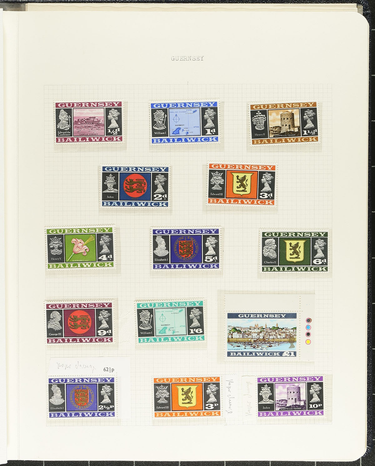 Collection of never hinged Guernsey, 1964-1997, containing many hundreds of stamps, neatly organized in hingeless mounts on stock or album pages in a thick binder. The collection ranges from Scott #1/185, along with back of the book issues, along with souvenir sheets and miniature panes, and more. A spot check indicated some material cataloguing $5 to $10 each, with owner's 2014 Scott catalogue value for the collection totaling US$686.00. A nice lot for Commonwealth collectors, overall fine to very fine. Estimate =