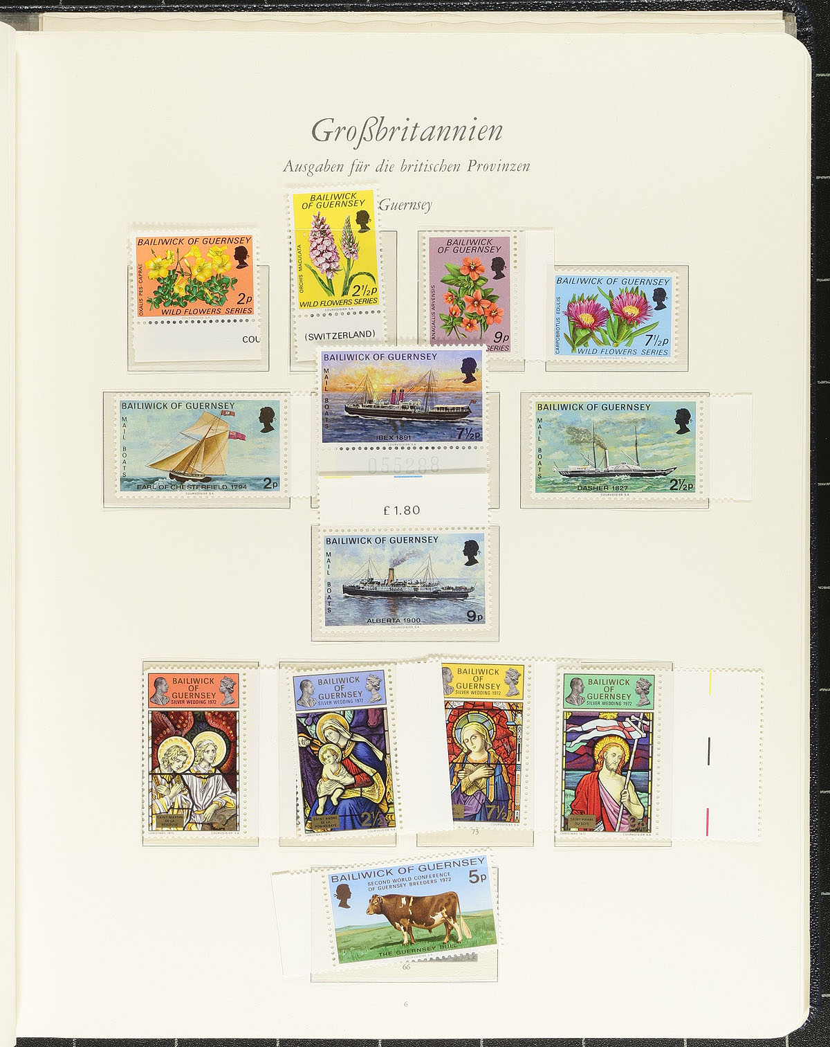 Collection of never hinged Guernsey, 1964-1997, containing many hundreds of stamps, neatly organized in hingeless mounts on stock or album pages in a thick binder. The collection ranges from Scott #1/185, along with back of the book issues, along with souvenir sheets and miniature panes, and more. A spot check indicated some material cataloguing $5 to $10 each, with owner's 2014 Scott catalogue value for the collection totaling US$686.00. A nice lot for Commonwealth collectors, overall fine to very fine. Estimate =