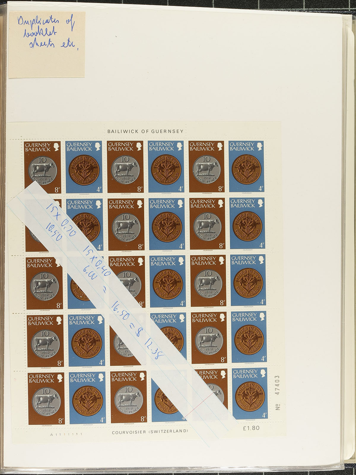 Collection of never hinged Guernsey, 1964-1997, containing many hundreds of stamps, neatly organized in hingeless mounts on stock or album pages in a thick binder. The collection ranges from Scott #1/185, along with back of the book issues, along with souvenir sheets and miniature panes, and more. A spot check indicated some material cataloguing $5 to $10 each, with owner's 2014 Scott catalogue value for the collection totaling US$686.00. A nice lot for Commonwealth collectors, overall fine to very fine. Estimate =