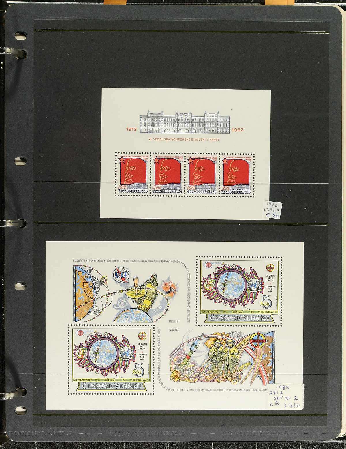 Lovely collection of primarily never hinged Czechoslovakia souvenir sheets and sheetlets, 1919-1988, containing many hundreds of items well organized in many stock pages housed in a binder. The collection generally ranges from Scott #292a/2709, along with semi-postals, noting perforated and imperforate sheets, with the majority of items from the 1960's to the 1980's. A spot check indicated a few souvenir sheets cataloguing $10 and up, with the majority $5 and under. A very nice group for all collectors. Estimate =