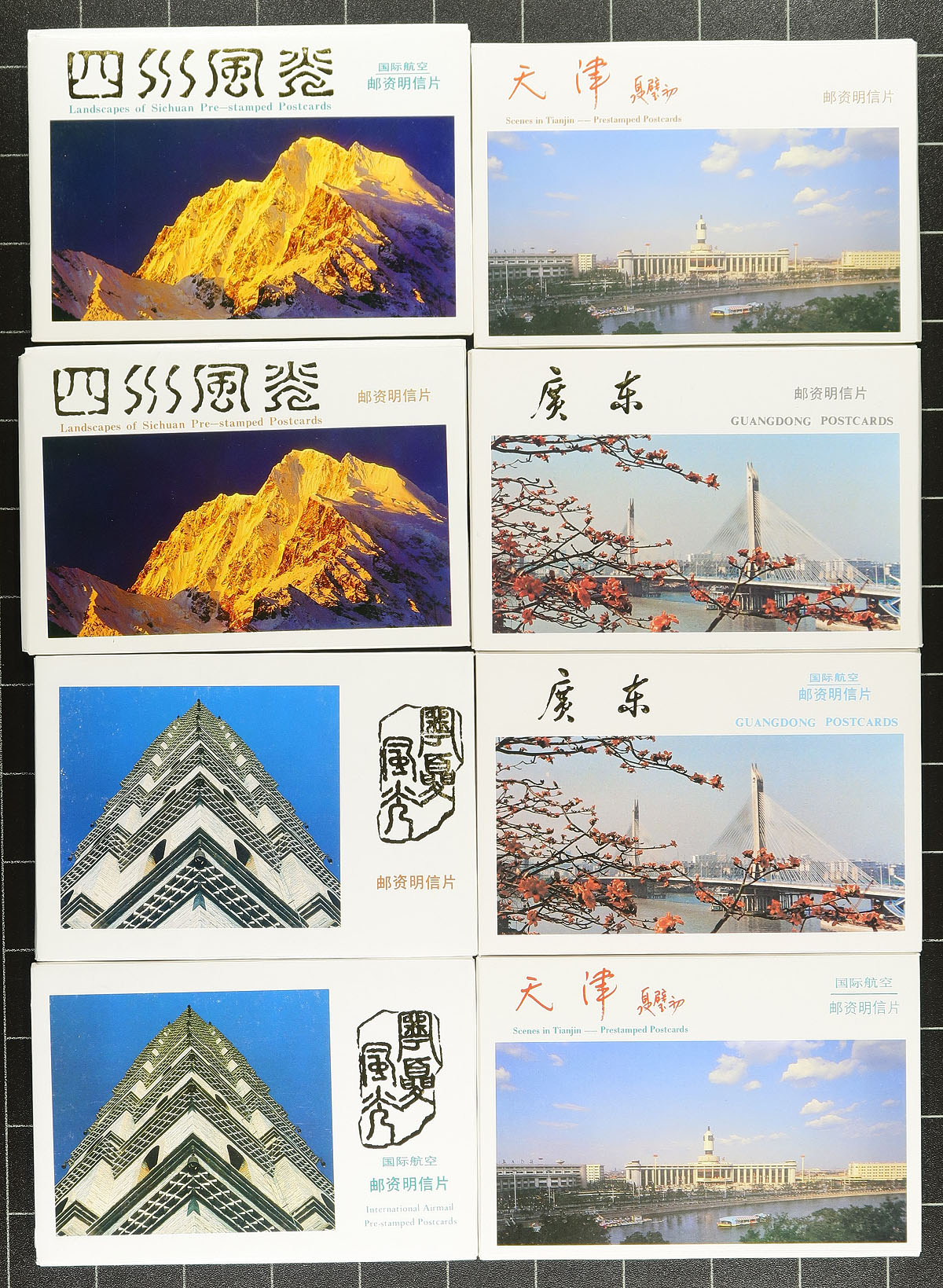 Very nice group of PRC China pre-stamped postal stationery view cards, 1986-2000. This lovely group contains 56 packs of 10 (560 individual cards in total), all in the original folders for both domestic and foreign air mail rates with many wonderful views from various locations in PRC China. Some mild duplication for a few years, still a clean lot for the stationery or post card collector. Estimate =