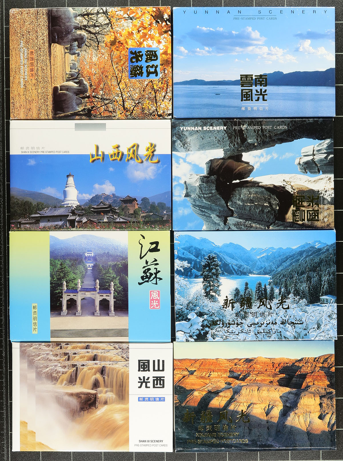 Very nice group of PRC China pre-stamped postal stationery view cards, 1986-2000. This lovely group contains 56 packs of 10 (560 individual cards in total), all in the original folders for both domestic and foreign air mail rates with many wonderful views from various locations in PRC China. Some mild duplication for a few years, still a clean lot for the stationery or post card collector. Estimate =