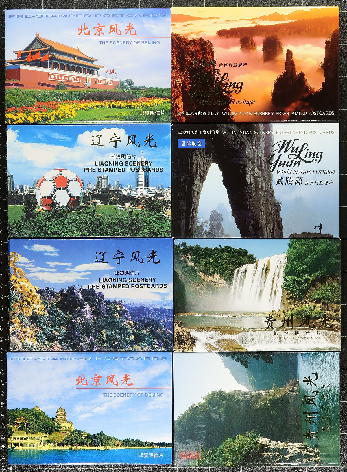 Very nice group of PRC China pre-stamped postal stationery view cards, 1986-2000. This lovely group contains 56 packs of 10 (560 individual cards in total), all in the original folders for both domestic and foreign air mail rates with many wonderful views from various locations in PRC China. Some mild duplication for a few years, still a clean lot for the stationery or post card collector. Estimate =