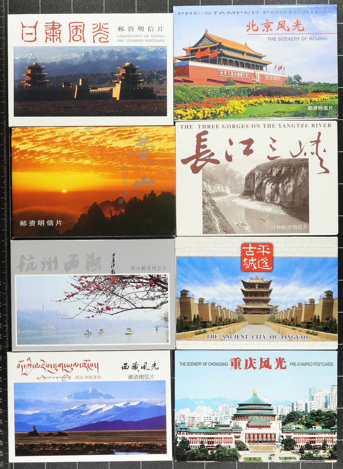 Very nice group of PRC China pre-stamped postal stationery view cards, 1986-2000. This lovely group contains 56 packs of 10 (560 individual cards in total), all in the original folders for both domestic and foreign air mail rates with many wonderful views from various locations in PRC China. Some mild duplication for a few years, still a clean lot for the stationery or post card collector. Estimate =