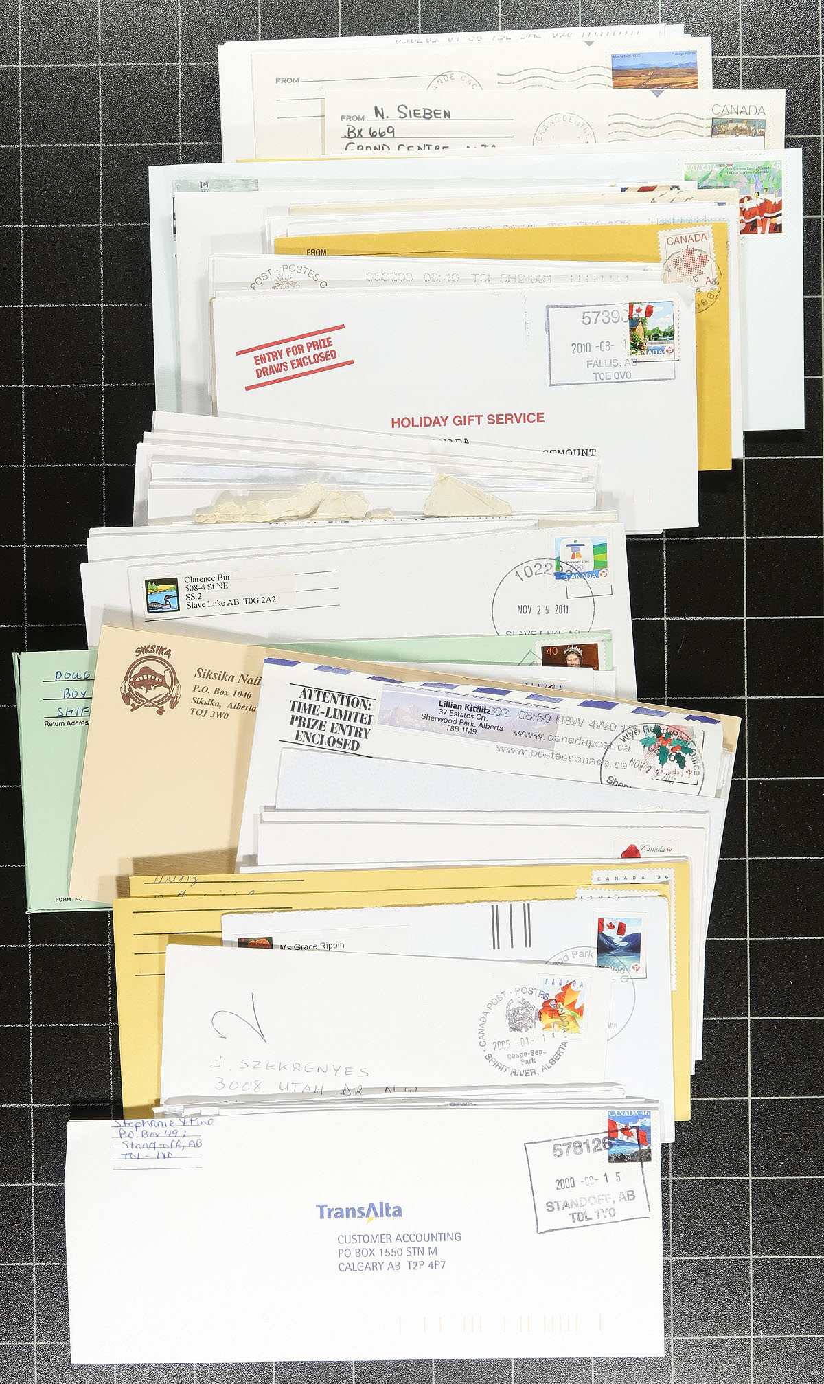 Alberta Postal History. Group of roughly 250 covers collected for Alberta town postmarks, 1960's-2000's, generally from town A to Z, with roughly over 100 different town represented, including various postal outlets including Dixonville, Grassy Lake, Fox Lake, Frog Lake, Falun, Sedalia, Peers, Patricia, Paradise Valley, and much more. Postmark interest includes various POCON types, cds, duplex, Pictorials, and more, with some towns having various postmark types. A nice lot for the Alberta or Canada postmark collector. Estimate =